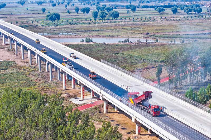 • 工人在241國道平遙段新建汾河大橋施工現(xiàn)場鋪設(shè)瀝青路面